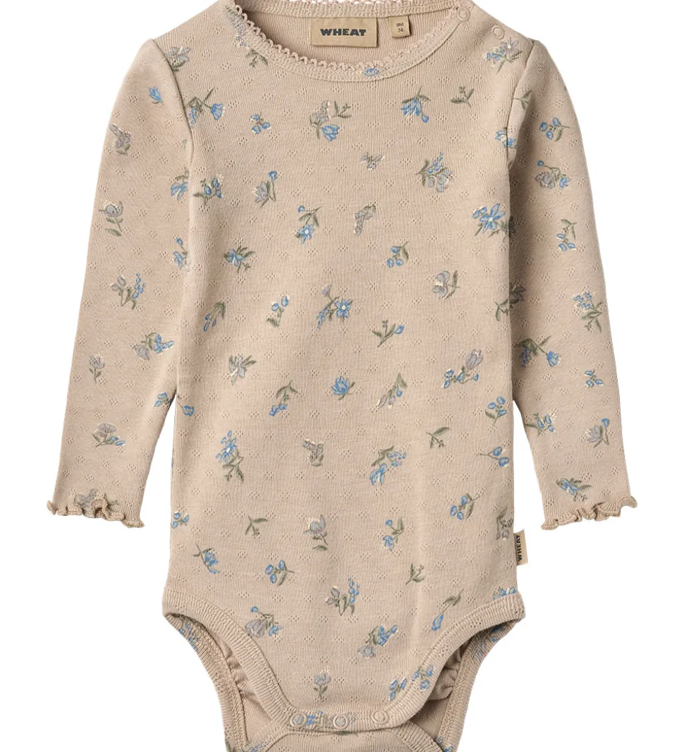 Yndig Wheat body i en lys beige nuance med et delikat allover blomstermønster i blå og grønne toner. Wheat bodyen har en praktisk åbning med trykknapper over venstre skulder samt fine dekorative detaljer i form af en smal blondekant langs halsudskæringen og bølgede kanter ved håndleddene.