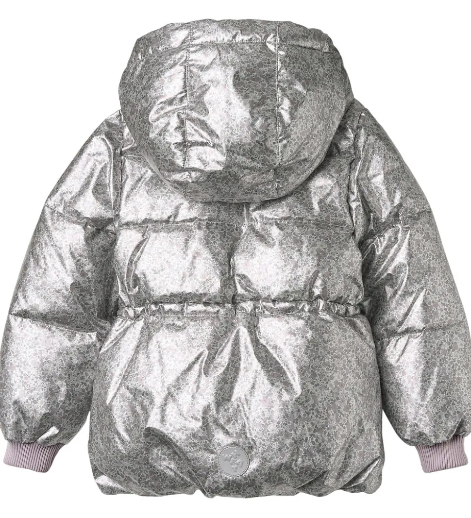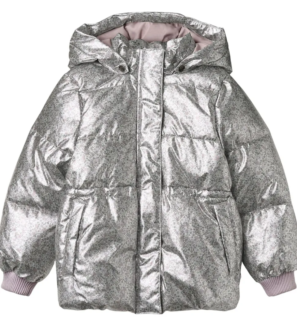 Lækker Wheat dynejakke i en skinnende sølvfarve med et alloverblomsterprint i støvet lilla, rosa og grønne farver. Dynejakken har vandrette syninger.