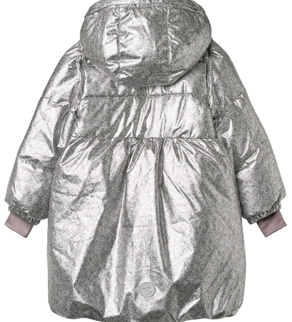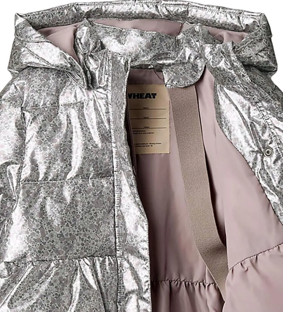 Lækker Wheat dynejakke i en skinnende sølvfarve med et alloverblomsterprint i støvet lilla, rosa og grønne farver. Dynejakken har vandrette syninger.