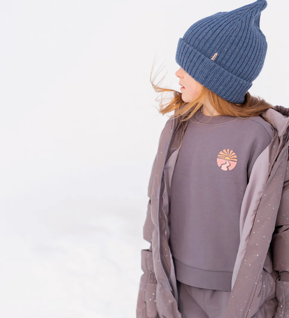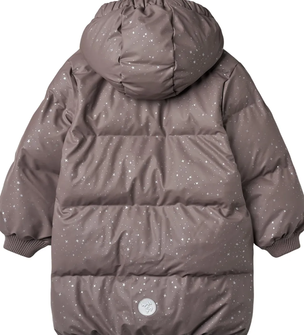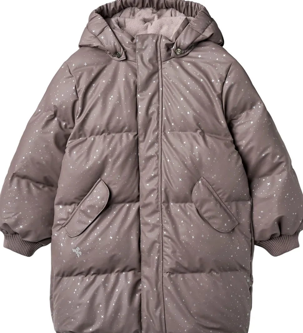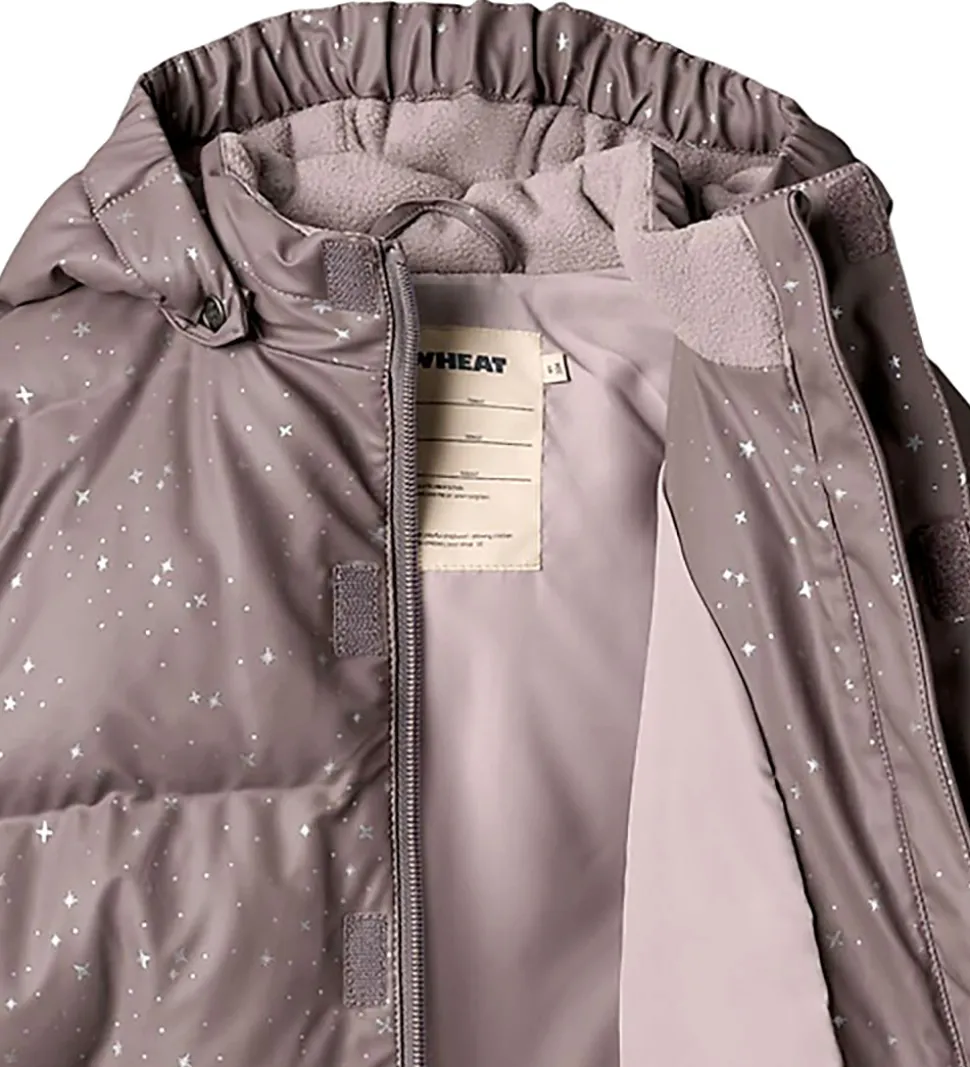 Skøn Wheat dynejakke af PU i lilla med print af små stjerner og med en struktur af indprægede, vandrette linjer. Dynejakken har velplacerede refleks-logoer.
