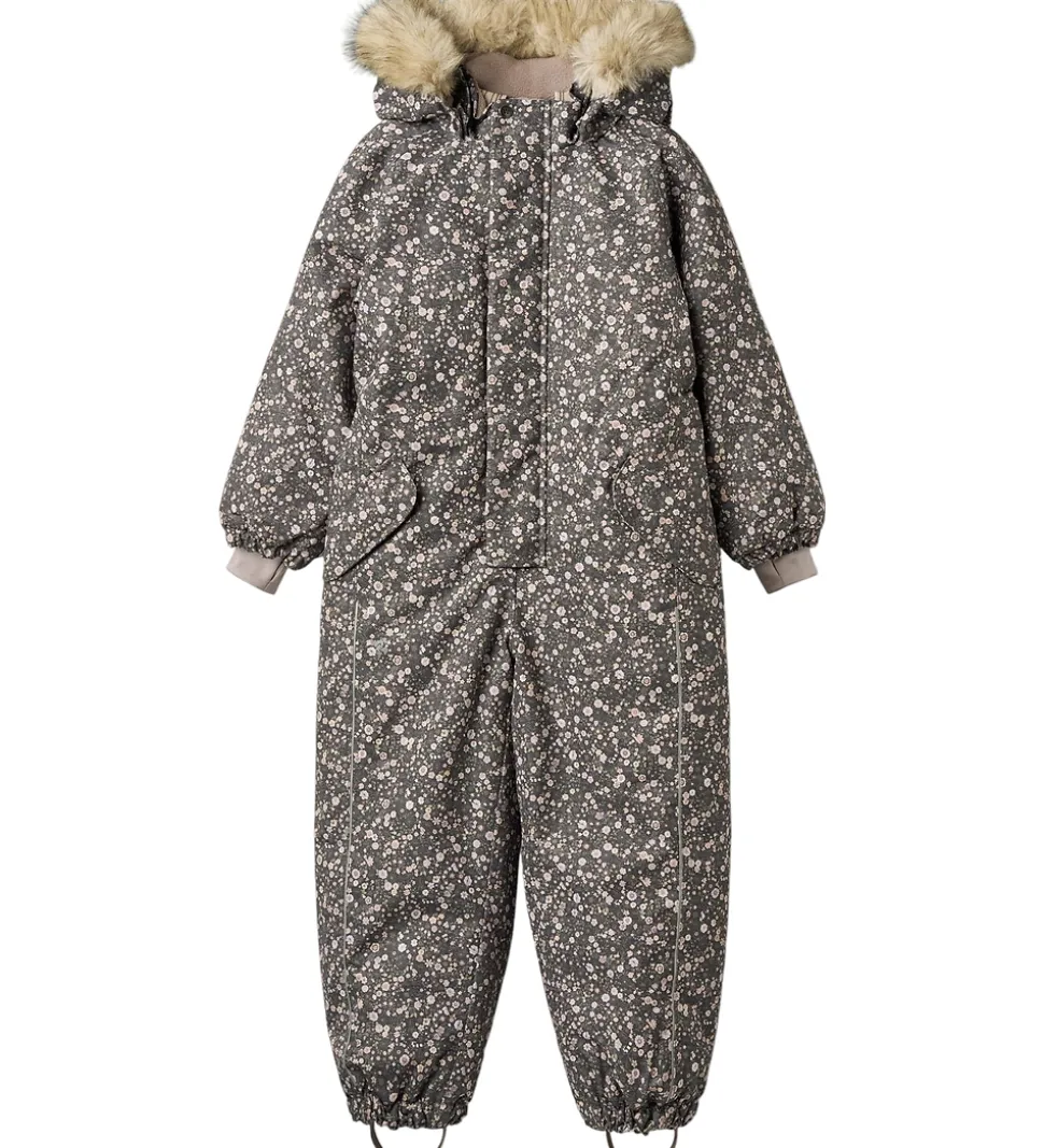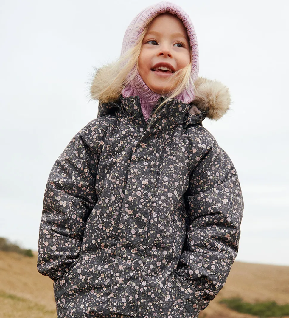 Pæn Wheat flyverdragt i mørk koksgrå med et alloverblomsterprint i støvede lilla, rosa og grønne nuancer og med en flot kant af imiteret pels på hætten. Flyverdragten rummer også både reflekspipings og -print.
