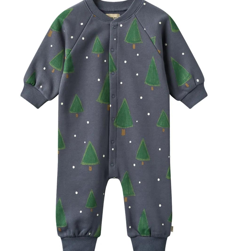 Charmerende Wheat heldragt i støvet blå med et fint print af juletræer og små, hvide snefnug over det hele.