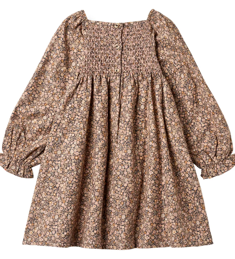 Fin Wheat kjole med et skønt alloverblomsterprint i bløde, rosa og lilla nuancer på en let koksgrå baggrund. Wheat kjolen har lange ærmer og smock-detaljer på overdelen, som giver en flot struktur. Den firkantede halsudskæring og lette rynker ved ærmerne tilføjer et elegant udtryk.