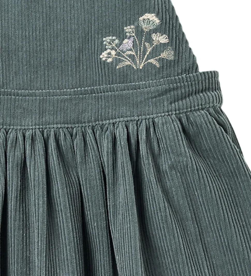 Elegant Wheat spencer i støvet blåt fløjl, og på brystet er der et fint blomsterbroderi. Kjolen har brede skulderstropper, som krydser opå rygge, og de kan justeres i to længder med en knap på ryggen. I lænden er der en bred elasttikkant, og skørtet har masser af vidde. I siderne er der praktiske lommer.
