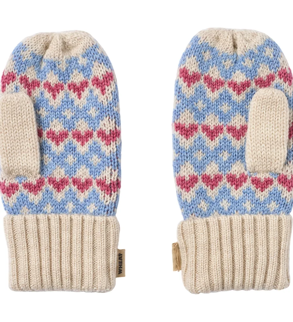 Skønne Wheat luffer strikket i beige med en jacquardstruktur af hjerter og et mønster i mørk rosa og blå.