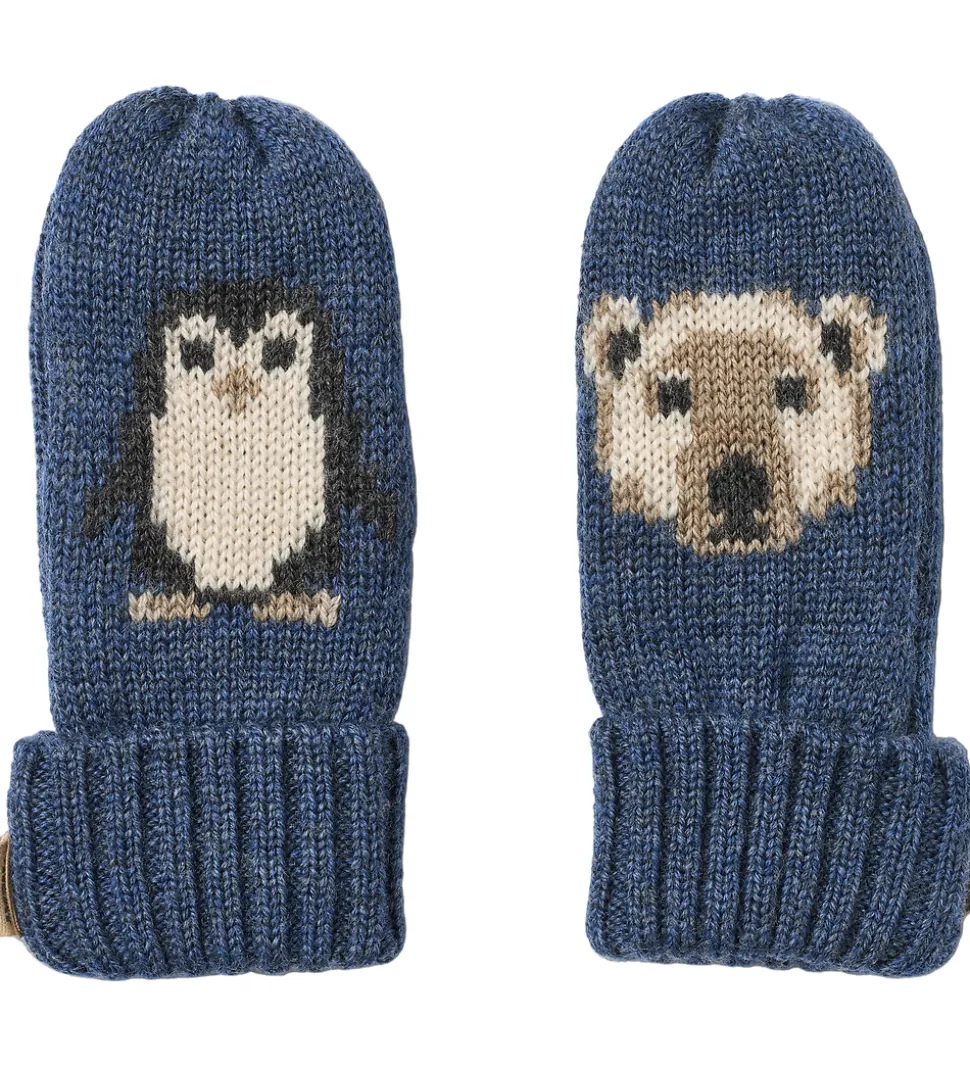 Skønne Wheat luffer strikket med en jacquardstruktur, hvor lufferne har hvert sit design. Den ene er blå med en isbjørn, mens den anden er blå med en pingvin.