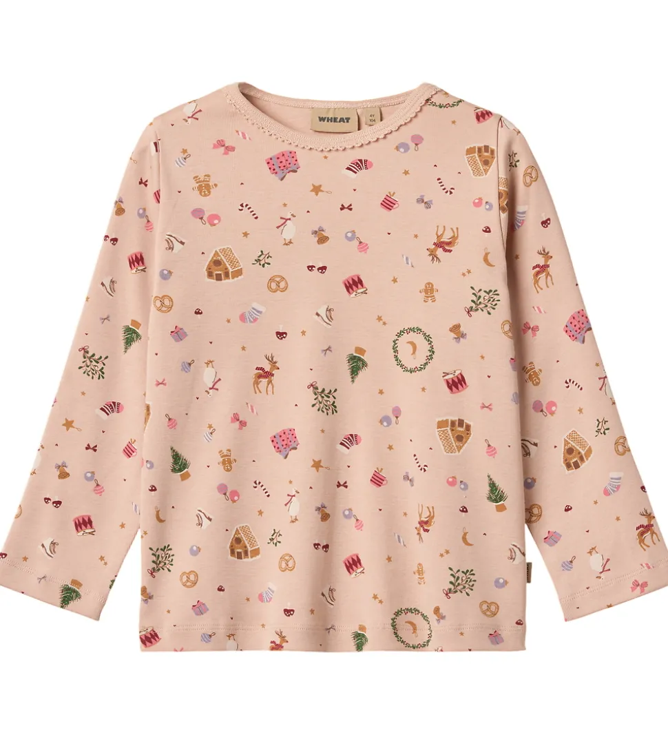 Fint Wheat nattøj bestående af bluse og bukser i lys rosa og med et detaljeret og farverigt print af forskellige julemotiver som rensdyr, gaver og juletræer. Natblusen har et minimalistisk design med en smal blondekant langs halsudskæringen. Natbukserne er med elastik i taljen og med brede ribkanter ved anklen, der sikrer en god og behagelig pasform.
