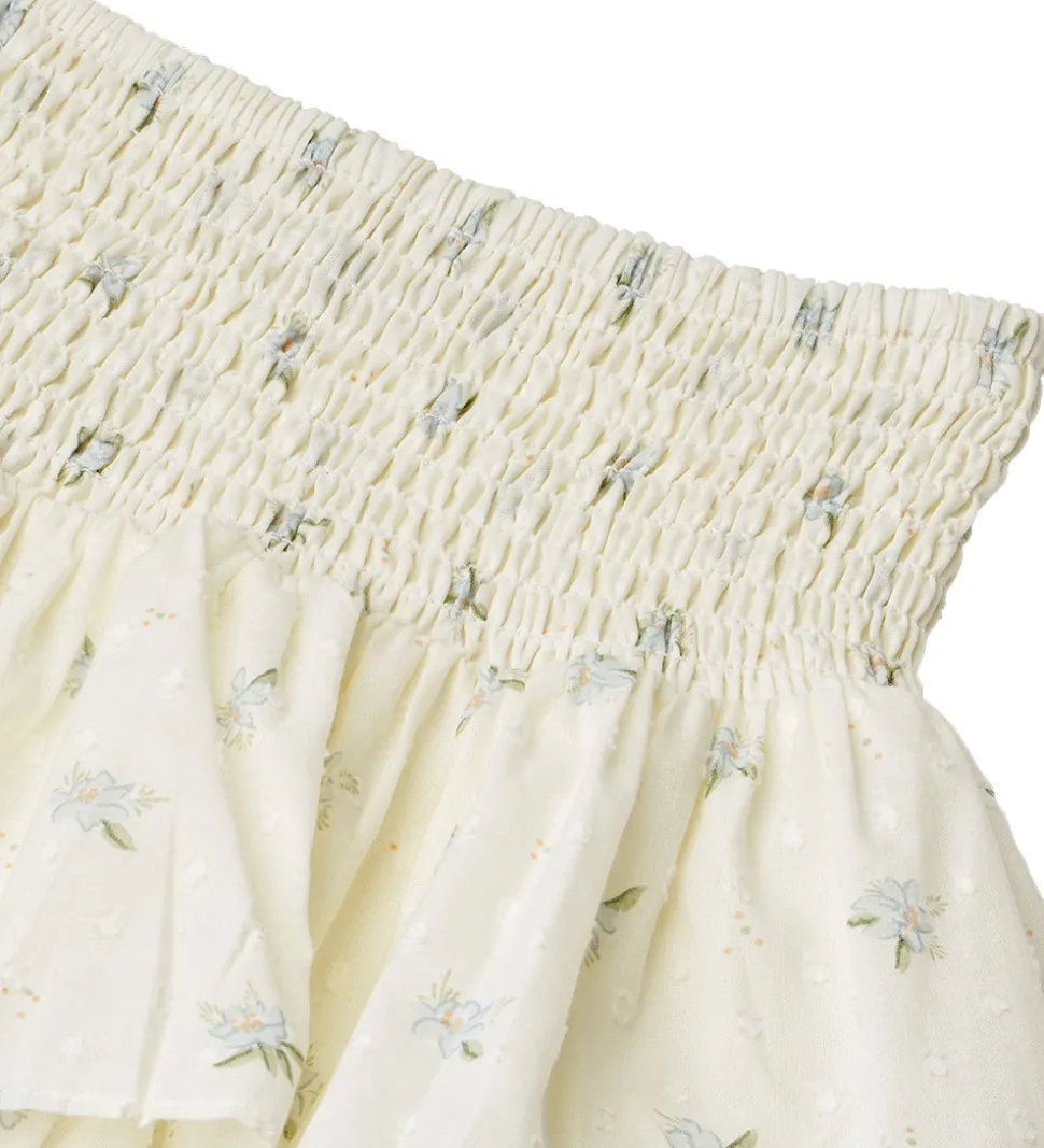 Charmerende Wheat nederdel i hvid med et fint blomsterprint. Nederdelen har en bred, elastisk talje for komfort og en let, flæset struktur, der giver et elegant udtryk. Perfekt til Wheat’s stilfulde garderobe.