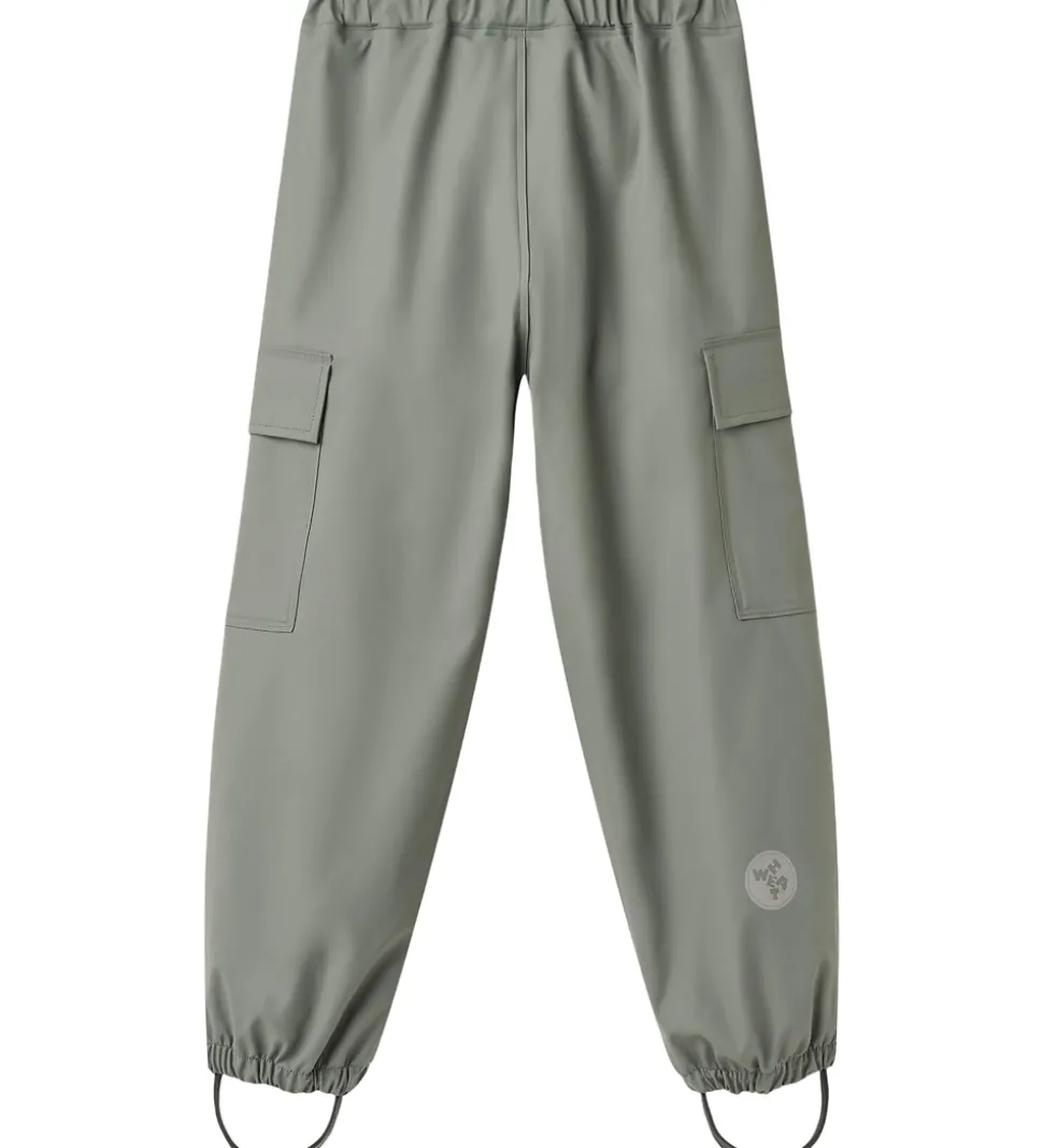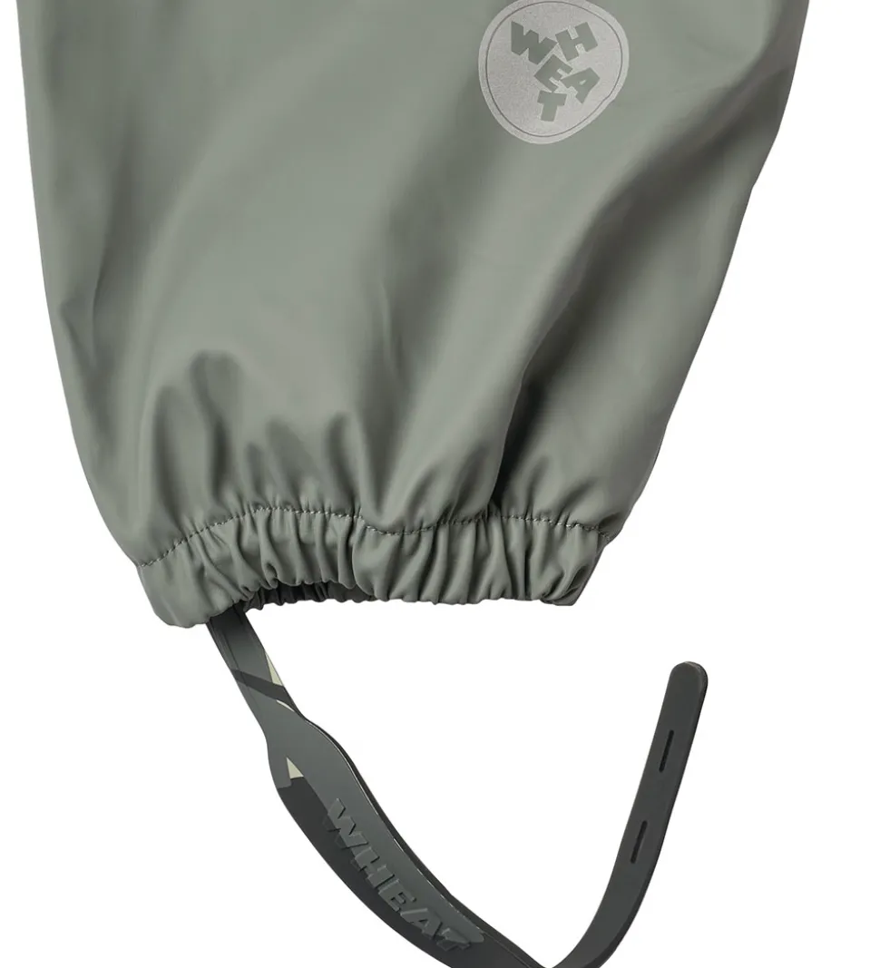 Wheat regnbukserne har elastiskkant i livet, og på siderne lårene er der to markante klaplommer med velcrolukninger. Buksebenene har elastikkanter om anklerne, og der er aftagelige, justerbare gummistropper til at sætte under fodtøjet.