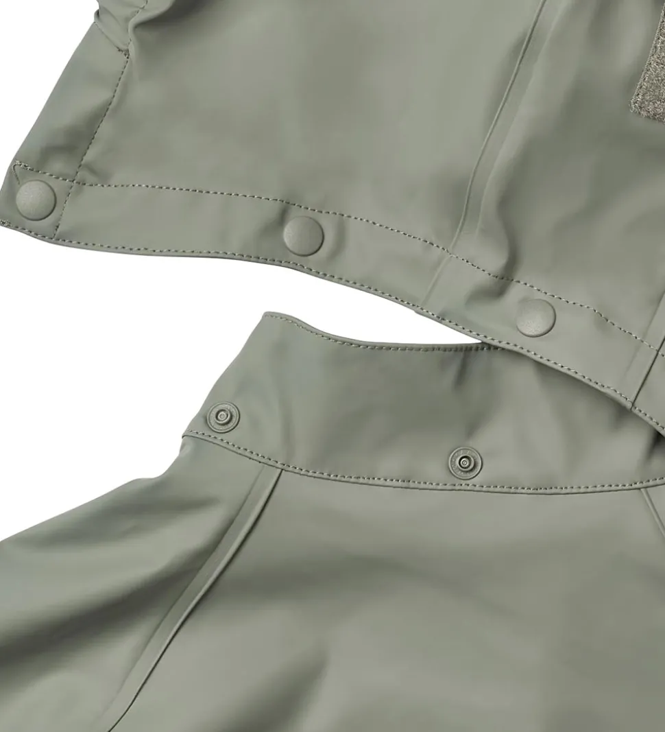 Wheat regnjakken har en aftagelig hætte, som fastgøres med trykknapper omkring halskraven, og har en elastikkant i toppen af ansigtsåbningen. På toppen af hovedet kan hætten justeres med en velcrostrop. Omkring håndleddene og i siderne af livåbningen er der elastikkanter. Regnjakken har skjulte, åbne lommer i siderne.