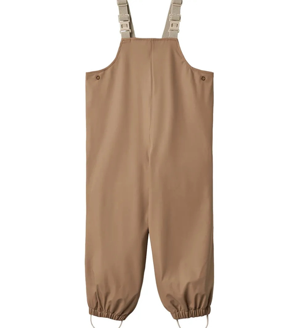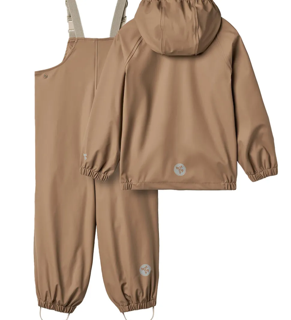 Dejligt Wheat regntøj af PU i nøddebrun og med refleksprint. Regntøjet består af en regnjakke og et par regnbukser med seler.
