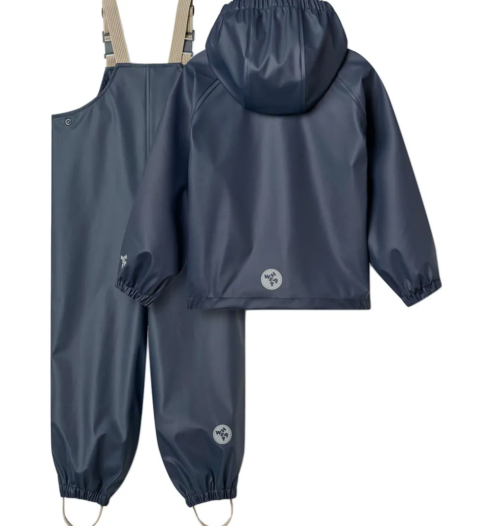 Skønt Wheat regntøj af PU i navyblå. Regntøjet består af en regnjakke og et par regnbukser med seler.