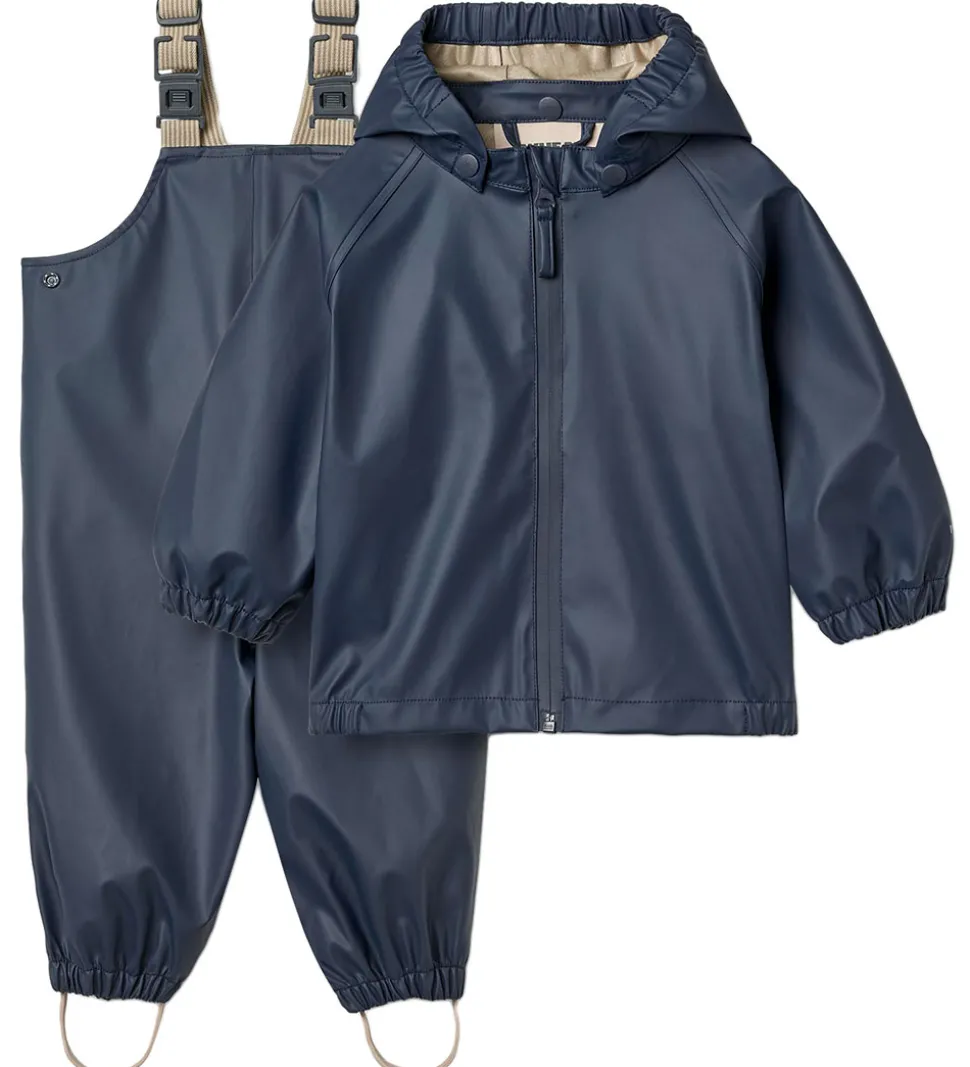 Skønt Wheat regntøj af PU i navyblå. Regntøjet består af en regnjakke og et par regnbukser med seler.