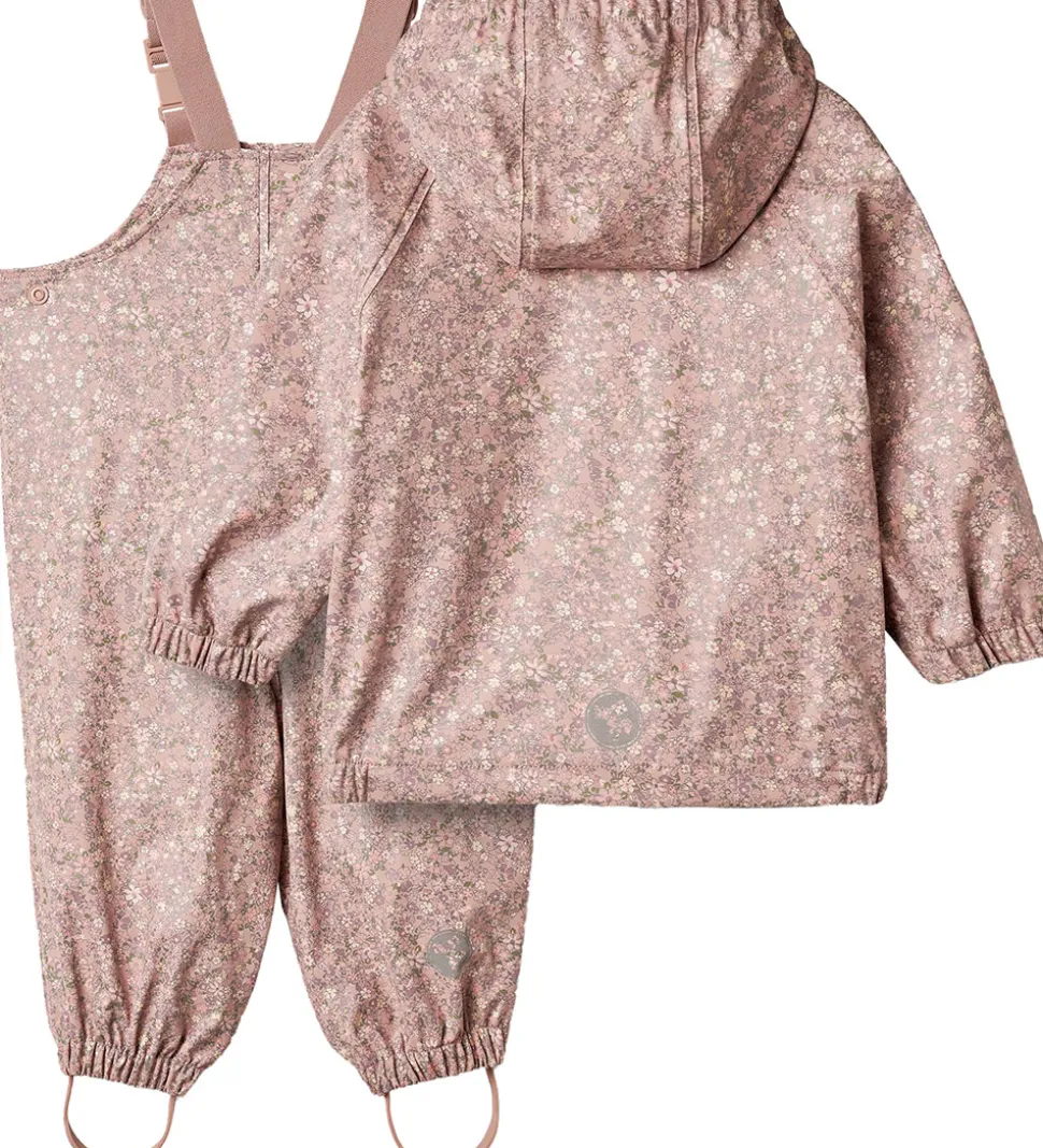 Lækkert Wheat regntøj af PU i rosa med et alloverblomsterprint samt med refleksprint. Regntøjet består af en regnjakke og et par regnbukser med seler.