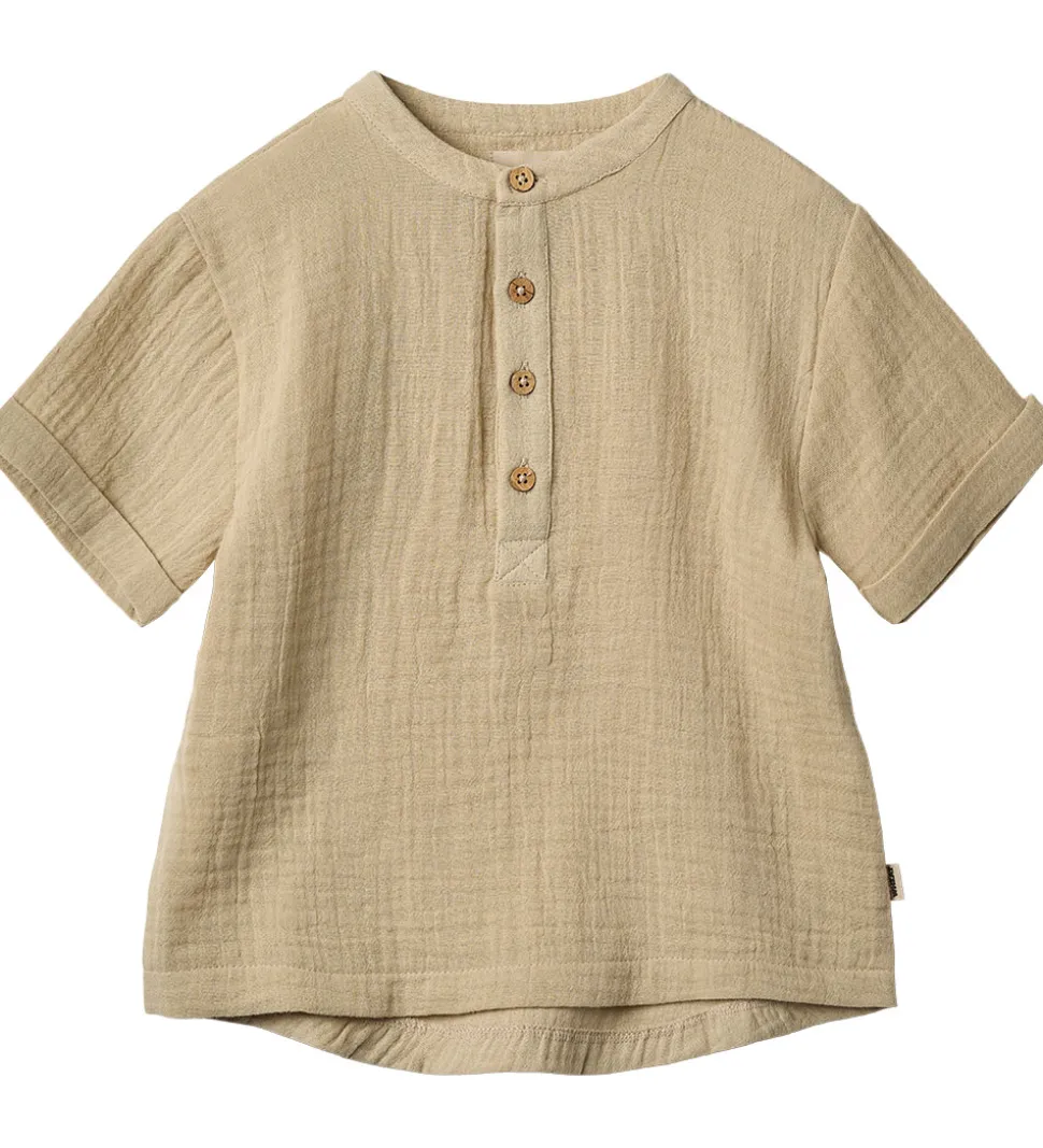 Flot Wheat skjorte i en varm, beige nuance med musselin struktur. Wheat skjorten har korte ærmer og en knaplukning foran, der tilføjer et stilfuldt touch. Perfekt til både afslappede og mere formelle anledninger.