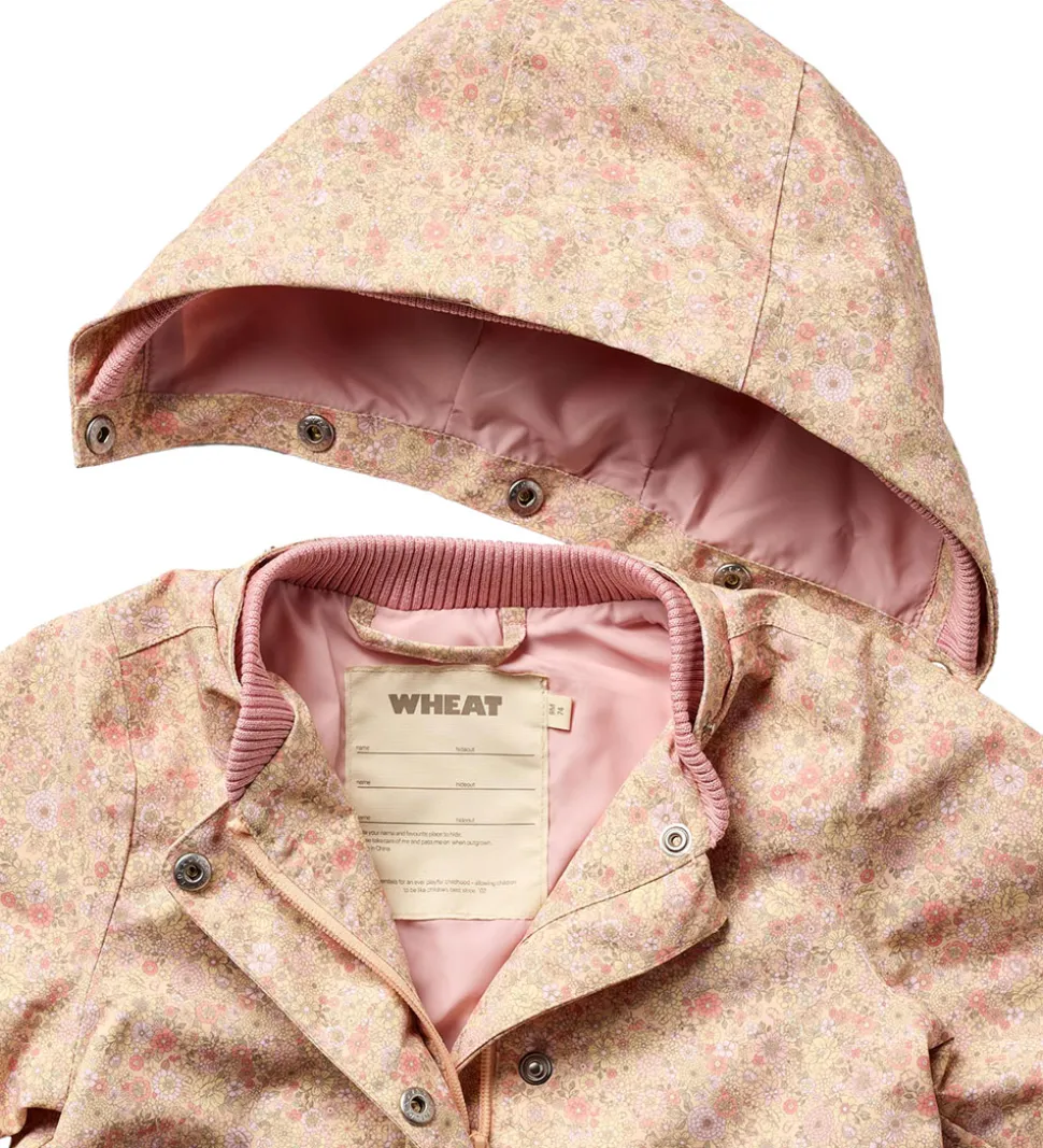 Wheat sommerjakken har en aftagelig hætte, som sidder fast med trykknapper. I toppen kan den justeres med velcro, og i ansigtsåbningen har den en bred ribkant. Ærmerne har elastikkanter, og i halsåbningen har den en blød ribkant. I taljen kan den strammes ind med en elastiksnøre på indersiden, så den får en flot, figursyet facon.