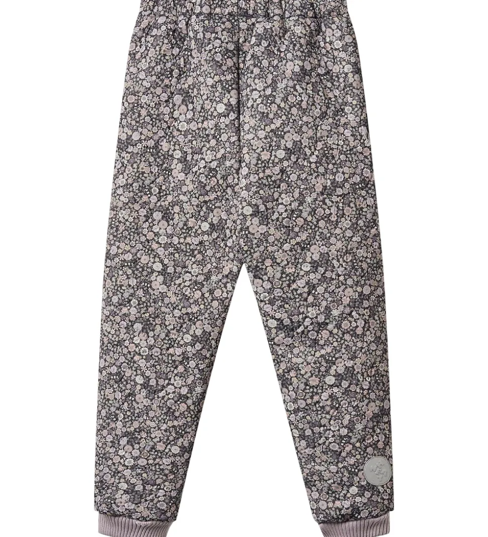 Flotte Wheat termobukser i mørk koksgrå med et alloverblomsterprint i støvede lilla, rosa og grønne nuancer samt ribkanter i støvet lilla. Termobukserne har en bølgende, quiltet struktur.
