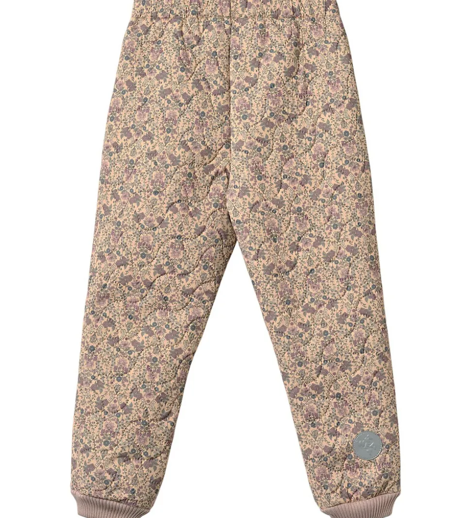 Flotte Wheat termobukser i korngul med et farverigt alloverblomsterprint i afdæmpede nuancer samt ribkanter i støvet rosa. Termobukserne har en bølgende, quiltet struktur.