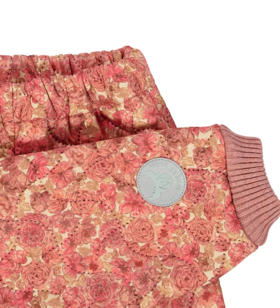 Skønne Wheat termobukser med et alloverprint af blomster i forskellige rosa nuancer på en beige baggrund. Termobukserne har en bølgende, quiltet struktur.