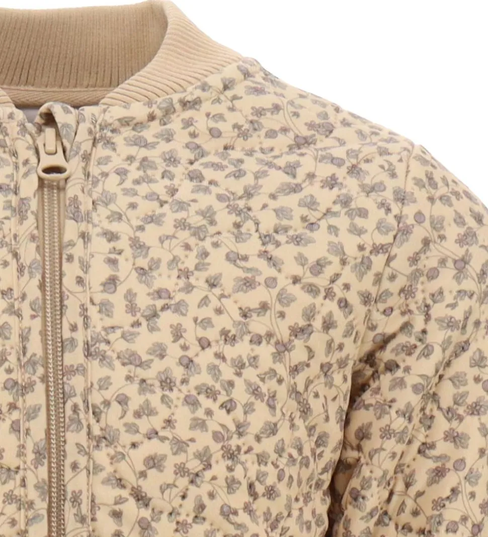 Lækker Wheat termojakke i gul med allover print med blomster og bær i grønne og lyseblå nuancer og med et bølgende, quiltet mønster.