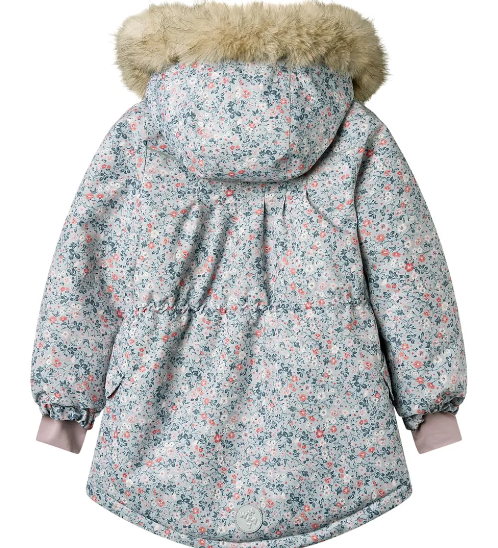Skøn Wheat vinterjakke i støvet, lys blå med et alloverblomsterprint i rosa, røde, hvide og blå farver og med en flot kant af imiteret pels på hætten.