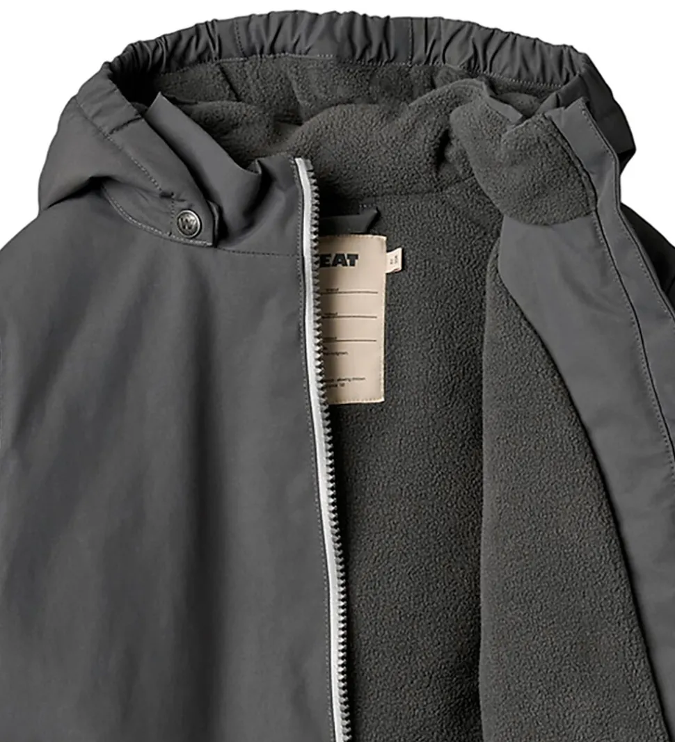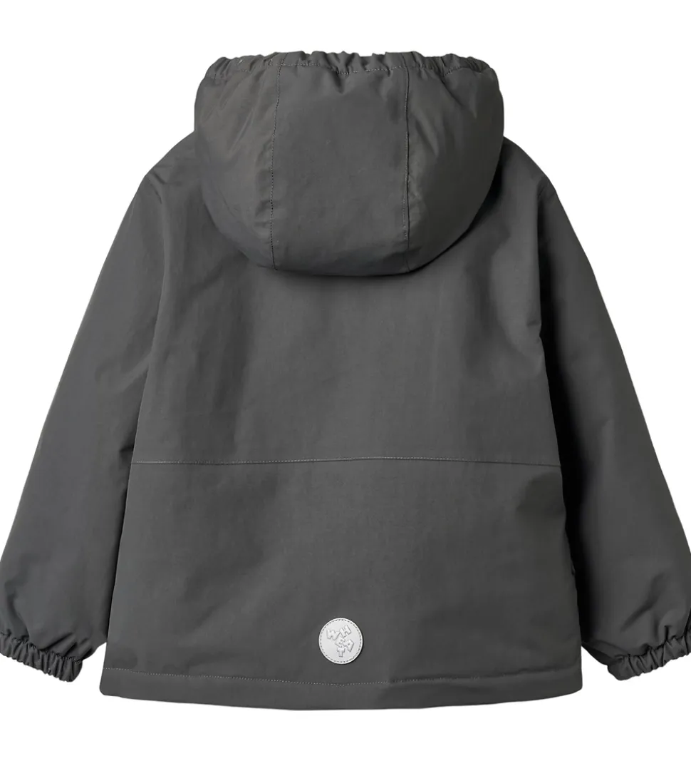 Fin Wheat vinterjakke i mørk koksgrå med refleksprint og -detaljer.