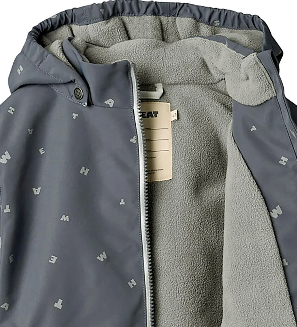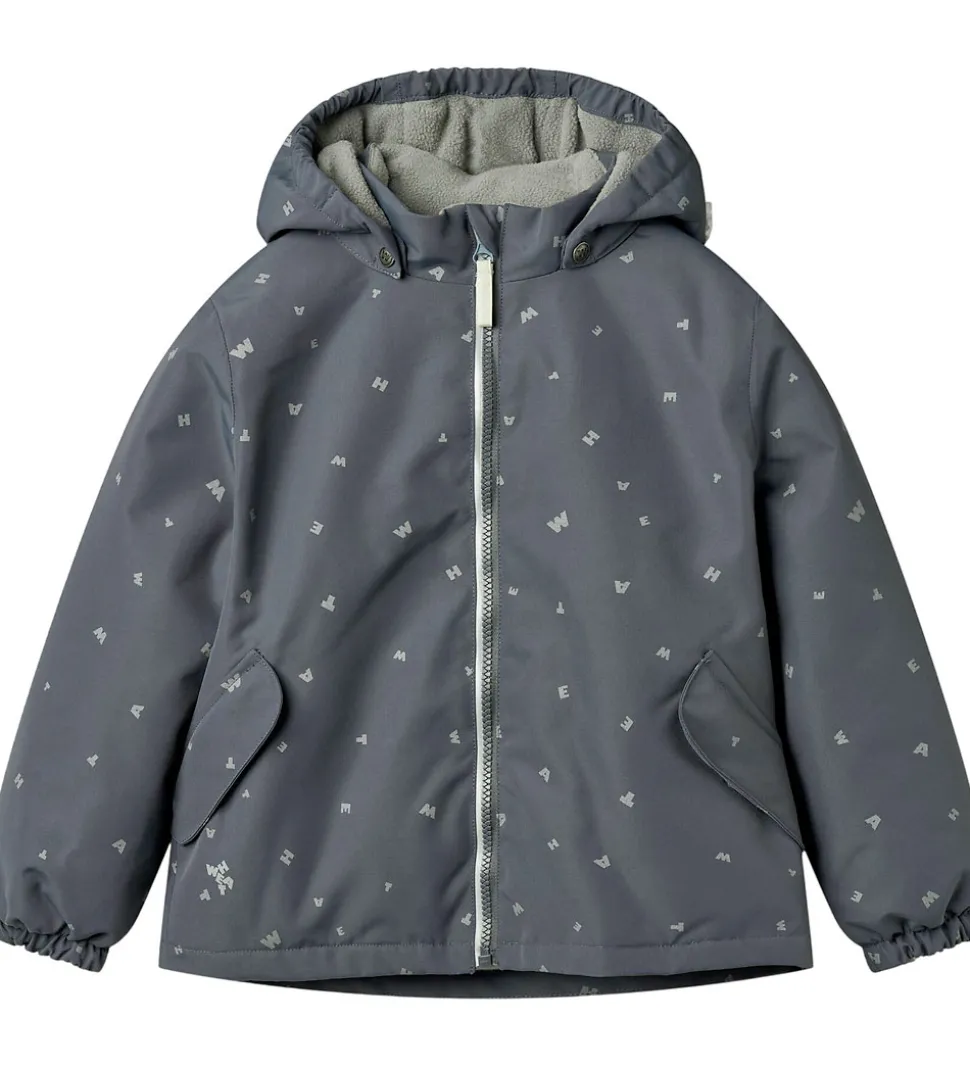Fin Wheat vinterjakke i gråblå med alloverprint af bogstaver fra brandets navn og refleksprint og -detaljer.