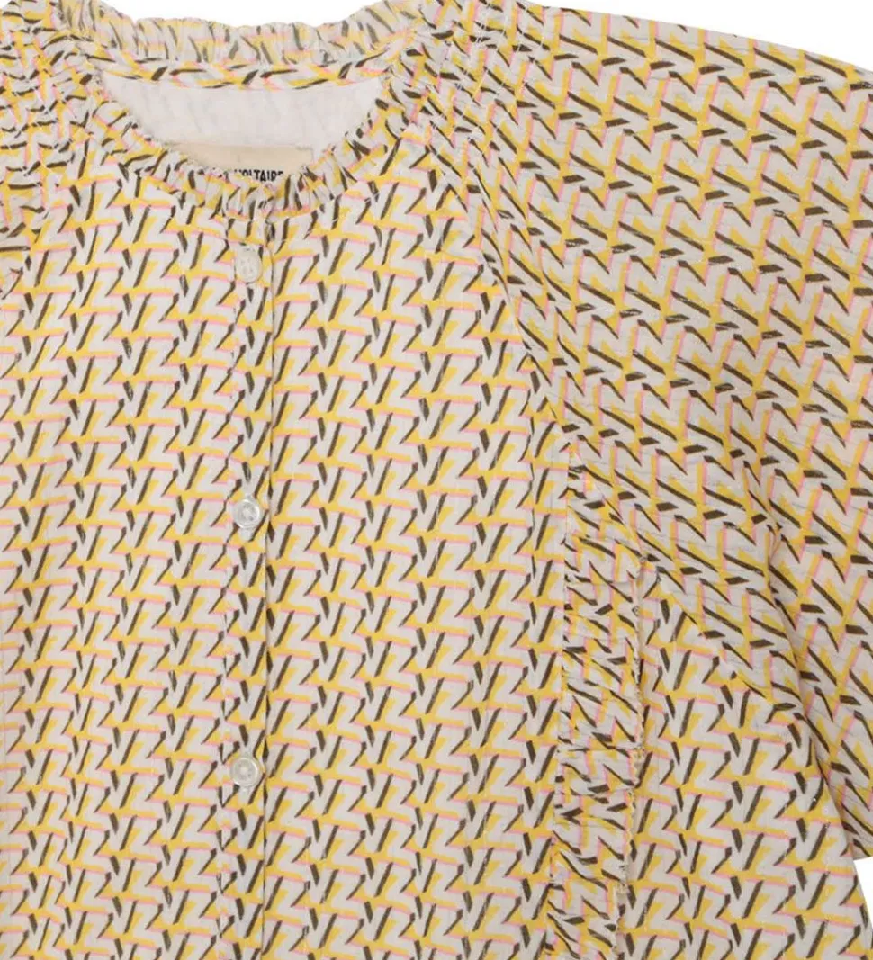Zadig & Voltaire toppen har korte ærmer med en god vidde. I halsåbningen har den en fin flæsekant, og ned ad siderne på fronten har den også fine flæser. Toppen åbnes hele vejen ned fortil med små, hvide knapper, og den er lavet i en let, fastvævet kvalitet.